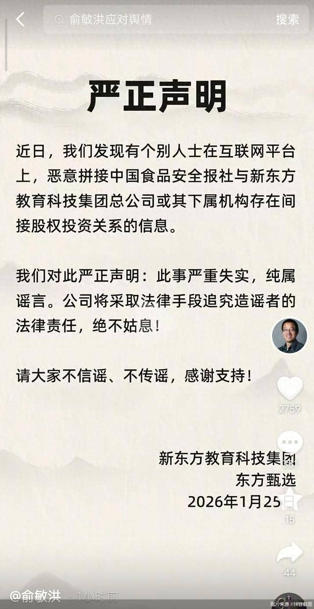 1月26日,新东方创始人、新东方教育科技集团董事长俞敏洪更新社交媒体发布严正声明称,近日,新东方发现有个别人士在互联网平台上,恶意拼接中国食品安全报社与新东方教育科技集团总公司或其下属机构存在间接股权投资关系的信息。
