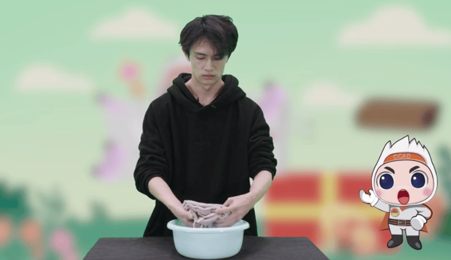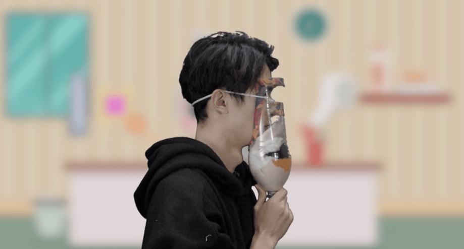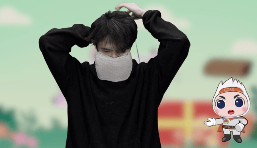 将口罩正面覆在脸上,闭环的绳子放在脖子后,带子系在耳后。使用过程中,注意保持毛巾一直湿润,过滤效果会更好。