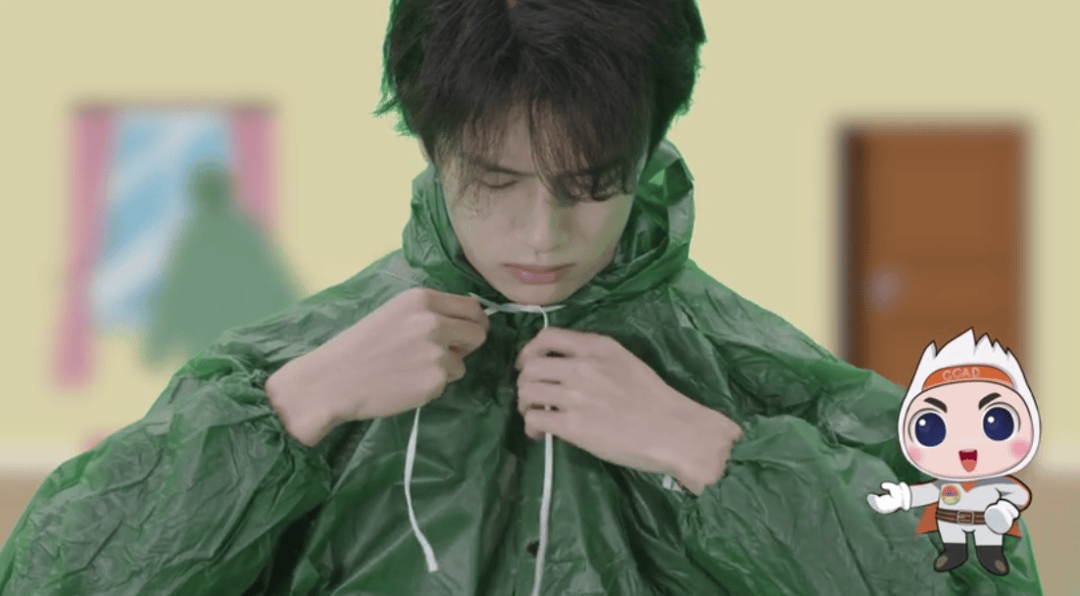 穿上一次性雨衣。