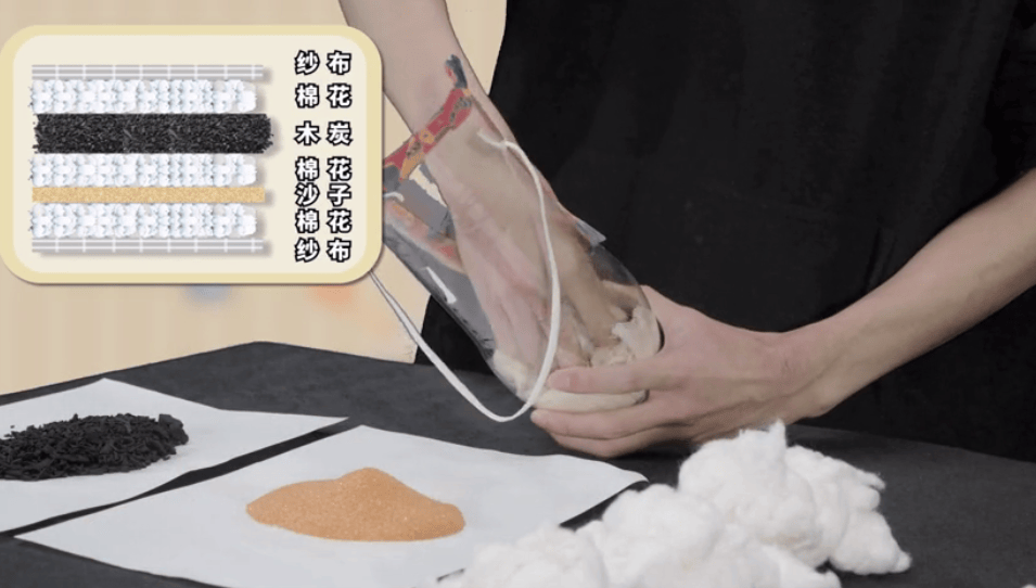 在瓶中依次填入纱布、棉花、沙子、棉花、木炭、棉花、纱布,一个简易的防护面罩就做好了。