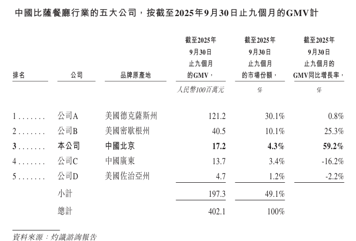据灼识咨询资料显示,以2025年前三季度GMV(商品交易总额)计,比格餐饮在本土比萨餐厅中排名第一,仅居于外来品牌必胜客、达美乐之后。同时在自助餐厅、西式休闲餐饮餐厅两个细分赛道均居于榜首。