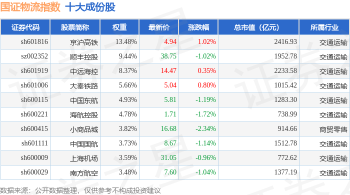 国证物流(399353)指数十大成份股详情如下: