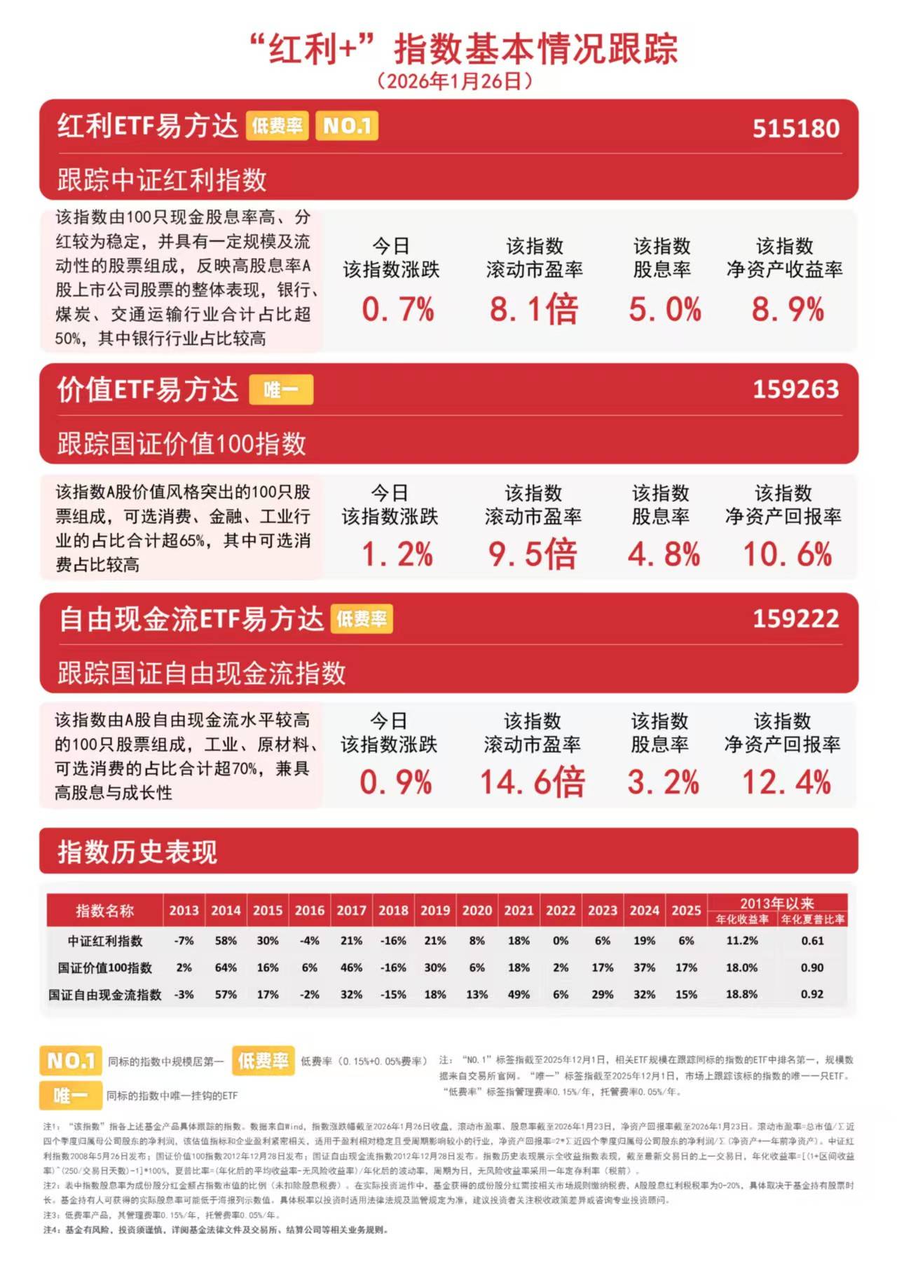 国证价值100指数采用“高分红+高自由现金流+低市盈率”三维筛选体系,优选价值标的,历史表现稳健;国证自由现金流指数则采用自由现金流率进行选样,兼具高股息与成长性。价值ETF易方达(159263)和自由现金流ETF易方达(159222)分别跟踪以上指数,可助力投资者把握相关风格投资机遇。