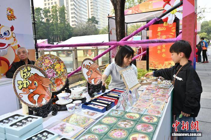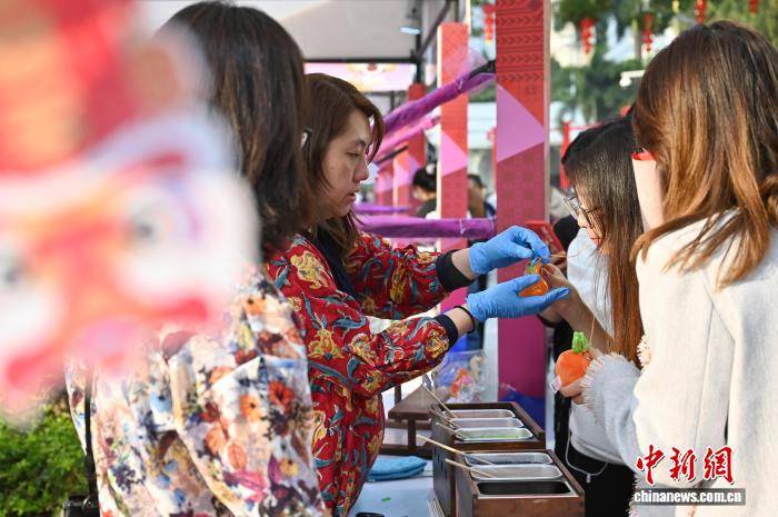 图为香港非物质文化遗产办事处的吹糖技艺摊位吸引游客体验。中新社记者 陈楚红 摄