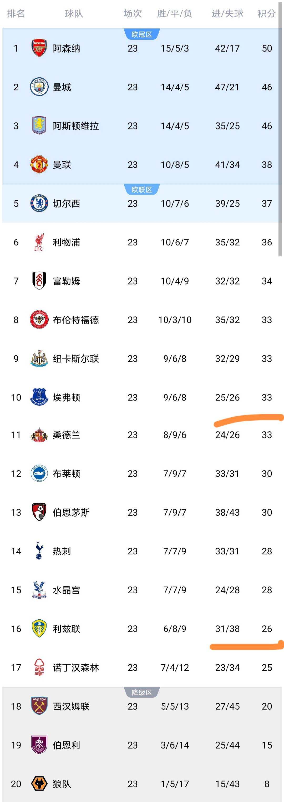 今天凌晨英超第23轮结束了最后一场的较量,埃弗顿出战,这场比赛之后,英超所有球队都已经踢完了第23轮的较量,英超积分榜也随之发生了变化,我们来看看。