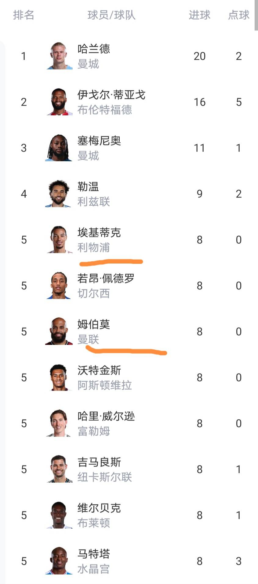射手榜前四分别是哈兰德、蒂亚戈、塞梅尼奥、勒温。