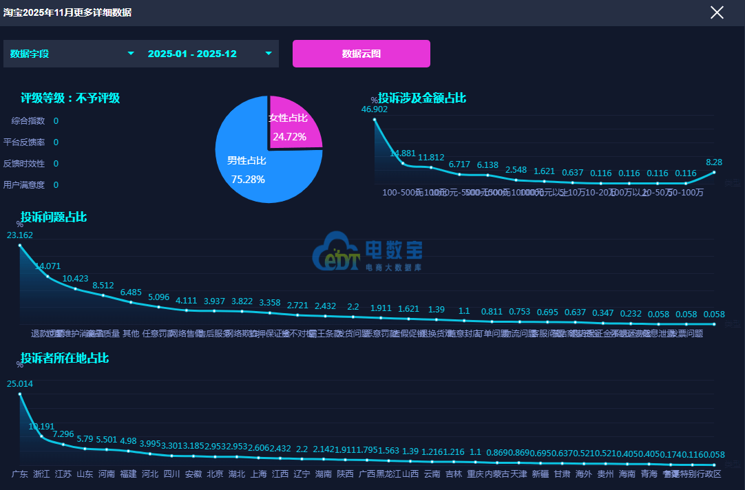 据网经社旗下电商大数据库“电数宝”监测 数据显示,“淘宝”2025年投诉的问题主要包括 任意仅退款、退款问题、过度维护消费者、商品质量等。