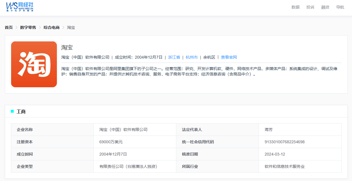 据网经社企业库显示,“淘宝”隶属于淘宝(中国)软件有限公司,成立于2004年12月7日,注册于浙江省杭州市,法定代表人为蒋芳。其是阿里 集团旗下的子公司之一。经营范围:研究、开发计算机软、硬件,网络技术产品,多 媒体 产品:系统集成的设计、调试及维护:销售自身开发的产品:并提供计其机技术咨询、服务,电子商务平台支持;经济信息咨询(含商品中介)。