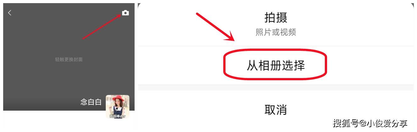 这个时候右上角看见没有?有个相机,我们把它点一下,然后下面有个从相册选择。