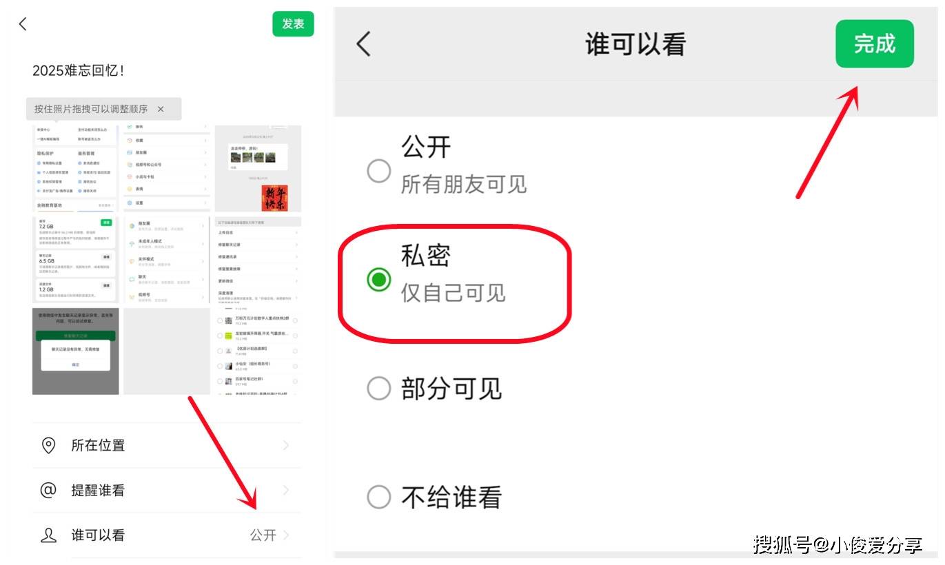 好,全部写好了之后,重点一步来了,这一步千万别搞错!大家看到没有,在这里有一个谁可以看,默认一般都是公开的哈,咱们需要把它设置成私密,然后点完成,最后点发表就可以了!