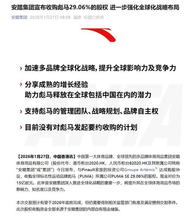 安踏集团公众号27日早间发文称,安踏体育用品有限公司今日宣布,与Pinault家族的投资公司Groupe Artémis达成购股协议,收购运动品牌彪马(PUMA)所属公司PUMA SE29.06%的股权。现金对价为15亿欧元(按当前汇率,约合人民币123.885亿元)。