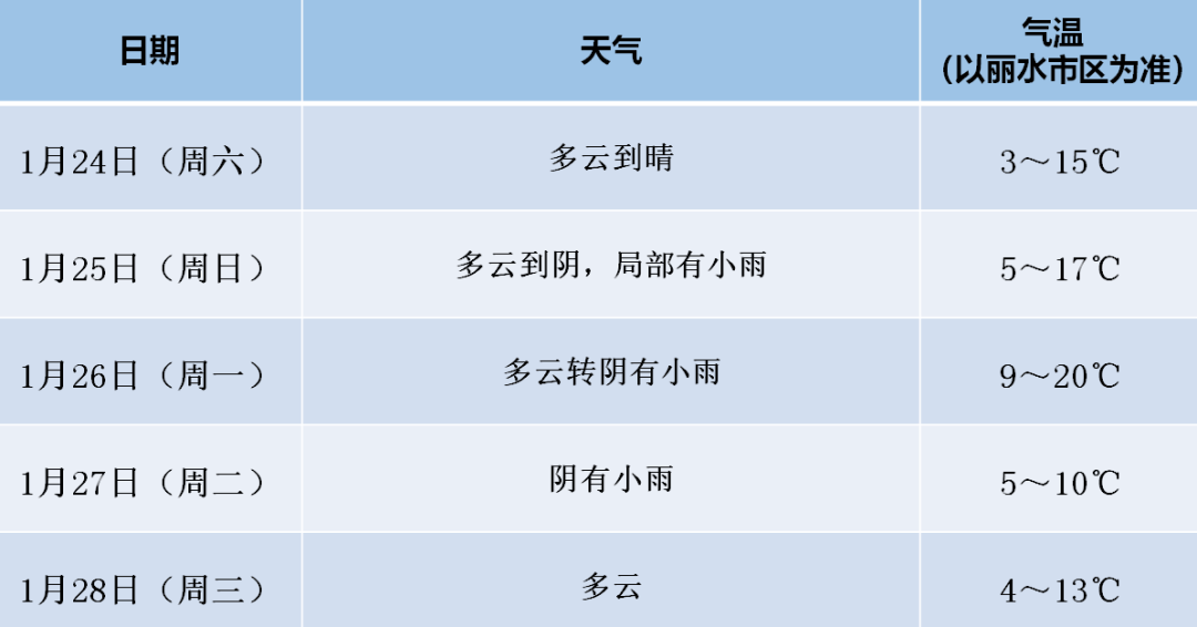 气温预报(以丽水市区为准):