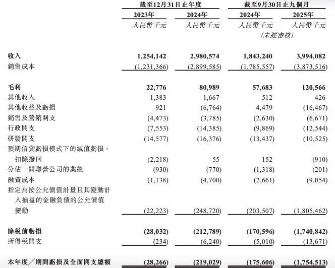 然而, 盈利层面却持续深陷亏损。 2023年、2024年,公司亏损及全面开支总额分别为2826.6万元、2.49亿元。 2025年前三季度,公司亏损及全面开支总额为17.55亿元,而上年同期亏损1.76亿元。