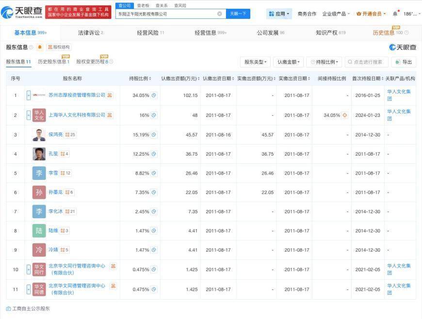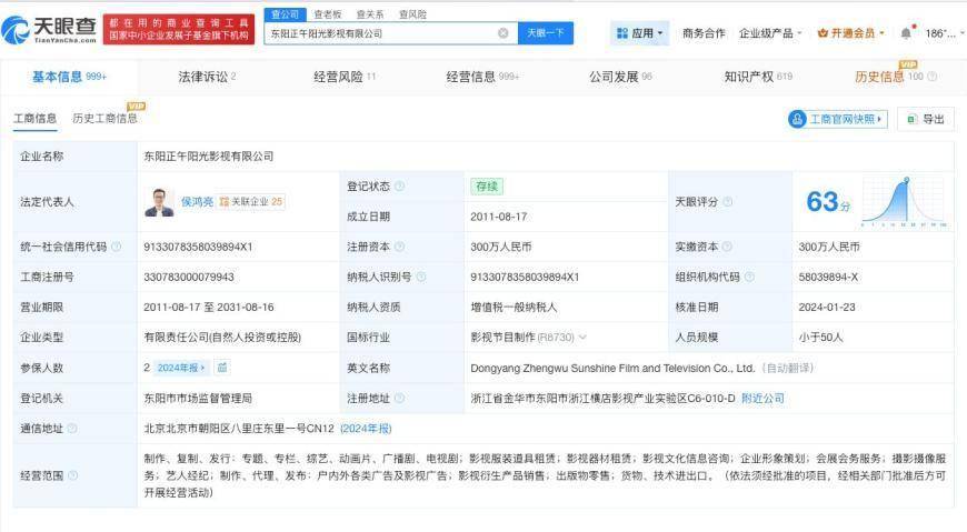 天眼查工商信息显示,正午阳光关联公司东阳正午阳光影视有限公司成立于2011年8月,法定代表人为侯鸿亮,注册资本300万人民币,经营范围包括制作、复制、发行:专题、专栏、综艺、动画片、广播剧、电视剧等。股东信息显示,该公司由苏州志厚投资管理有限公司、上海华人文化科技有限公司等共同持股。对外投资信息显示,该公司对外投资21家企业,其中9家处于存续状态,包括海南正午阳光影视有限公司、厦门正午阳光影视有限公司等。