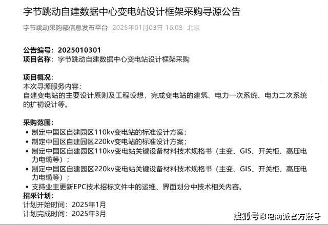 今年年初,字节更是发布了《字节跳动自建数据中心变电站设计框架采购寻源公告》,计划采购自建变电站的主要设计原则及工程设想,完成变电站的建筑、电力一次系统、电力二次系统的扩初设计等,自建数据中心变电站支持算力。