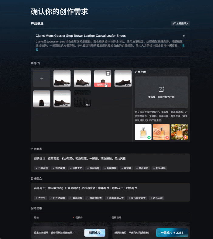 分析提取信息后系统会与你确认创作需求,包括产品信息、素材、主图选择、产品卖点、目标受众、促销优惠、营销节点、视频比例、视频时长、视频语言、数字人形象和配音,目前平台已经支持全球主流语种,可以很好的应对各种市场需求。