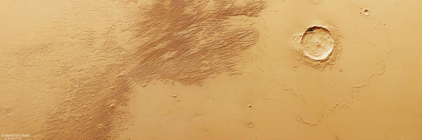 这些地貌位于欧迈尼德斯背岭(Eumenides Dorsum)的北端,该山脉向西延伸至著名的塔尔西斯(Tharsis)火山区,并构成了巨大的、尘土飞扬的梅杜莎槽沟层(Medusae Fossae Formation)的一部分。