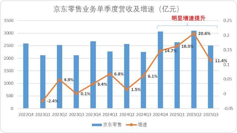 从表面看,京东零售业务今年增速亮眼:前三季度营收增速分别为16.3%、20.6%和11.4%,从过去的低个位数跃升至双位数。