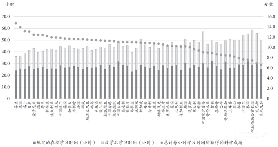 第四,我国基础教育课程在适应个别差异、为学生提供个性化发展空间方面尚不充分,必修学科课程门类和内容偏多、课程超载的问题还比较突出。在国际比较中,我国学生学习效率偏低、付出的时间成本偏高的问题较为明显(见图1)。这些问题不解决,创新精神与实践能力的培养就缺乏充足的空间,《纲要》精神的落实也难以实现。