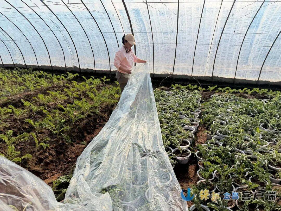 隆冬时节,寒意渐浓,金昌市金川区双湾镇许家沟村的蔬菜大棚内却暖意融融。1月21日,记者走进种植户潘燕的羽衣甘蓝种植大棚,只见她正小心翼翼地给刚栽种的幼苗覆盖塑料薄膜,工人们也各司其职,忙着打理枝叶、检查长势。“盖层薄膜能有效锁住水分,保住棚内温度,再过一天,这些幼苗就能缓过来。”潘燕一边忙活,一边向记者介绍道。