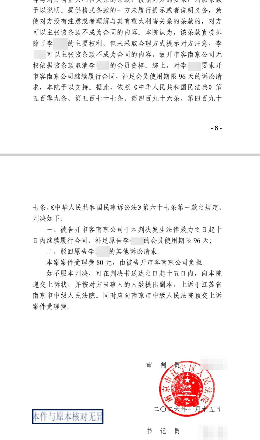 因此,南京市江宁区人民法院作出判决,开市客南京公司继续履行合同,补足李先生会员使用期限96天。