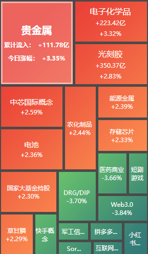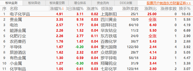板块方面:涨少跌多,电子化学品、贵金属、电池、能源金属、化肥行业涨幅居前,医药商业、互联网服务、文化传媒、软件开发、通信服务板块跌幅居前。