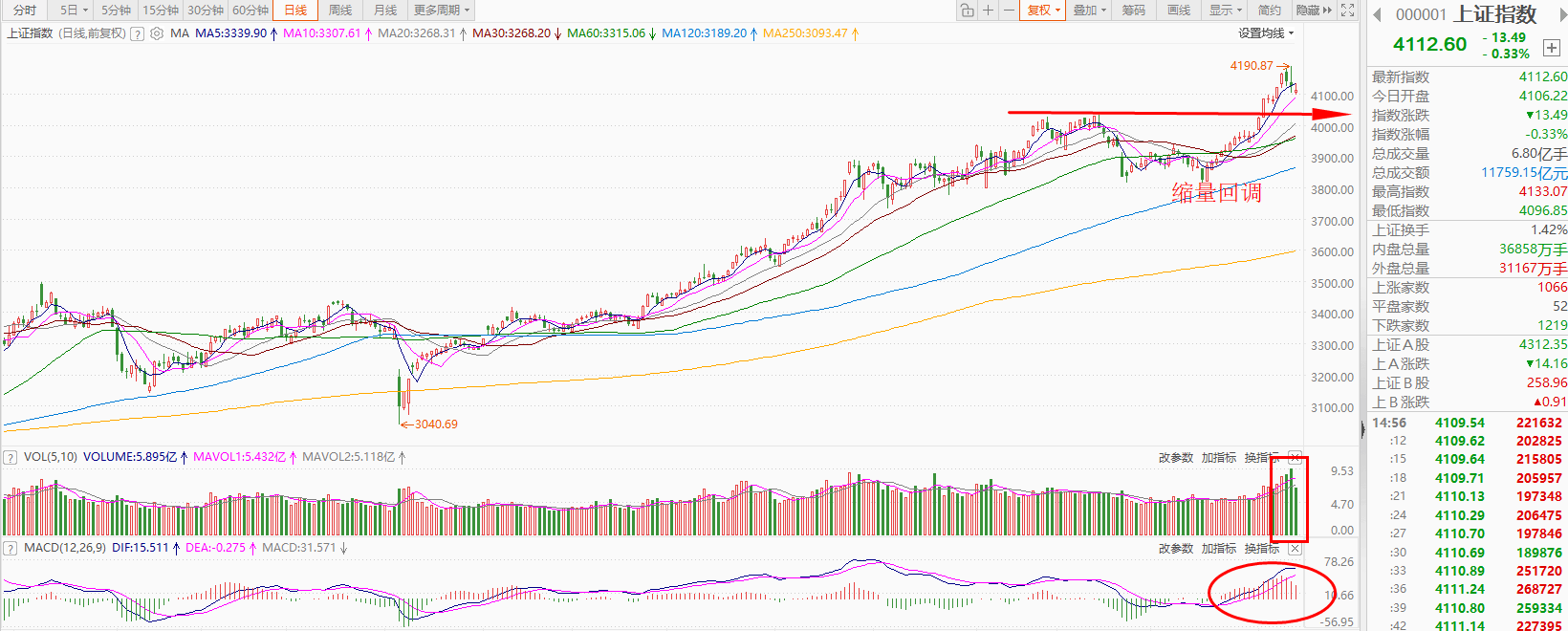 上证指数早盘小幅低开,随后震荡调整,午后窄幅盘整,截止收盘,指数下跌0.33%,收出十字线,全天成交额1.18万亿,相比上交易日的1.61万亿,减少了4300亿。