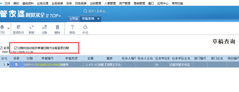 登录管家婆财贸软件,进入草稿查询页面可以看到左上角有个“批量过账时修改单据日期为录单日期”选项。 如果草稿过账需要自动修改单据日期为登录日期可以勾选一下此配置然后选中单据点击上方的过账按钮过账,过账后单据的日期会自动更新为当前登录系统的日期,对应的单据编号也会随之刷新变化。