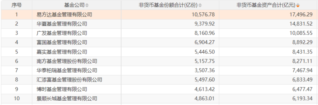 第三、四名的广发基金与南方基金地位稳固,非货规模分别增长至1万亿元与8271亿元。