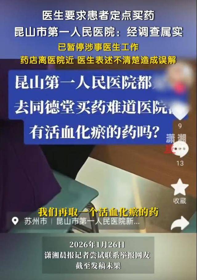 1月27日,昆山市第一人民医院工作人员答复证实,确实存在医生指定药店的情况,“药店离医院近,医生表述不清楚造成误解,已暂停涉事医生工作。”