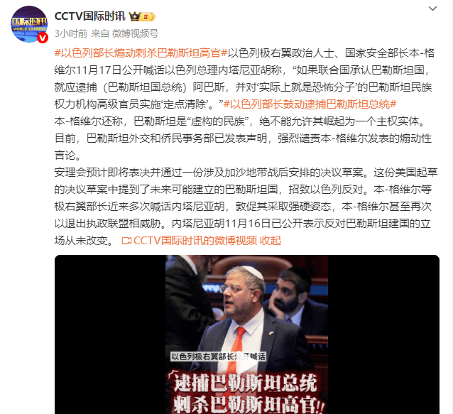 安理会预计即将表决并通过一份涉及加沙地带战后安排的决议草案。这份美国起草的决议草案中提到了未来可能建立的巴勒斯坦国,招致以色列反对。本-格维尔等极右翼部长近来多次喊话内塔尼亚胡,敦促其采取强硬姿态,本-格维尔甚至再次以退出执政联盟相威胁。内塔尼亚胡11月16日已公开表示反对巴勒斯坦建国的立场从未改变。