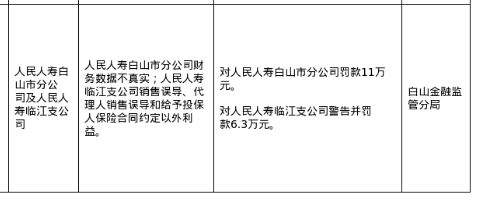 针对上述违法违规行为,国家金融监督管理总局白山监管分局对人民人寿白山市分公司罚款11万元;对人民人寿临江支公司警告并罚款6.3万元。