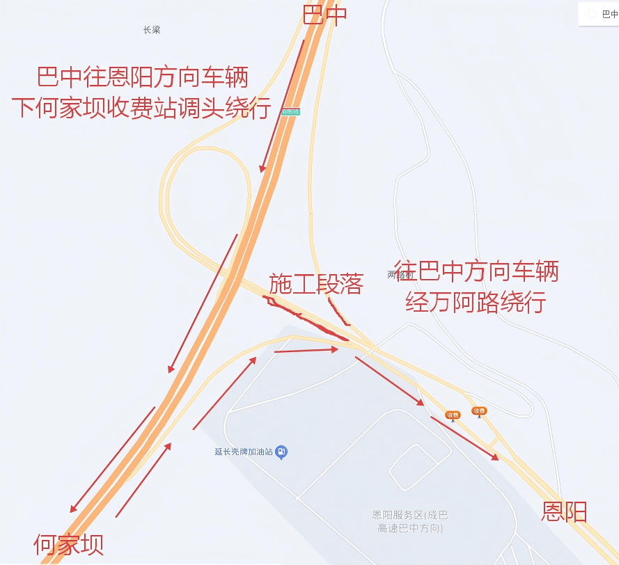 自巴中驶往恩阳方向的车辆,可直行至何家坝收费站下站,随后掉头重新上站绕行前往恩阳。