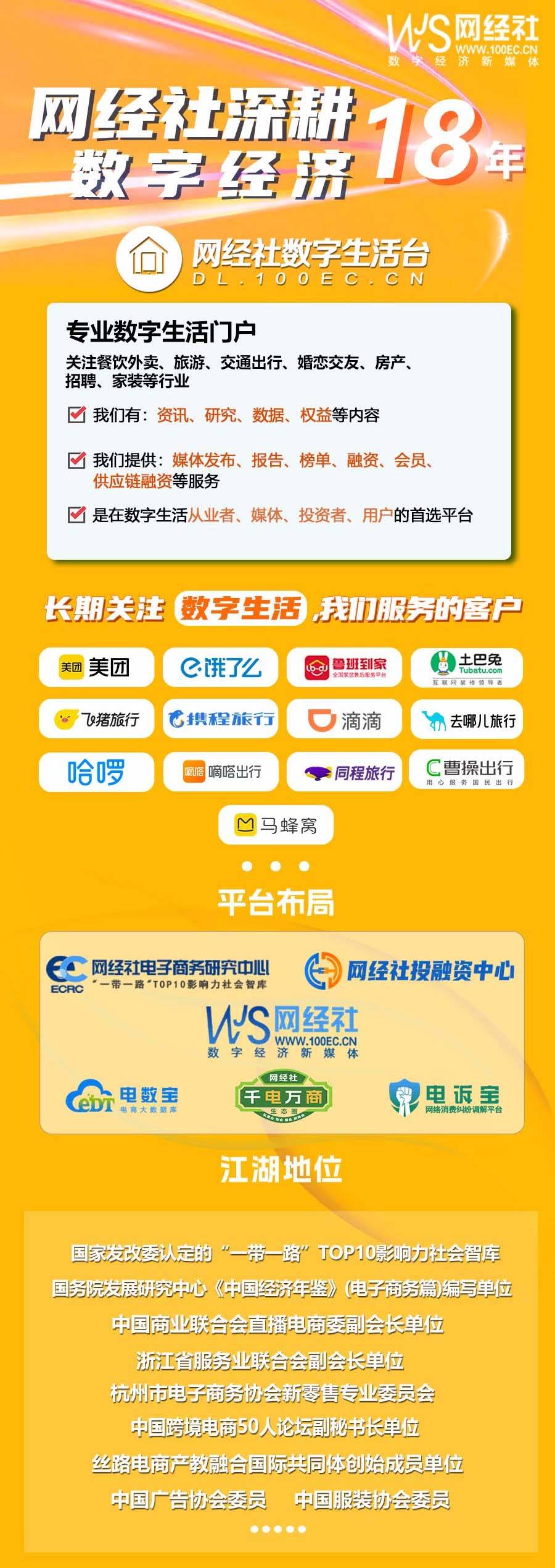 网经社数字生活台(DL.100EC.CN)是专业数字生活门户,重点关注餐饮外卖、旅游出行、婚恋交友、互联网房产、互联网招聘、互联网家装等;有资讯、数据、研究、权益等内容,提供媒体发布、报告榜单、融资、会员、供应链金融、售后顾问等服务,是数字生活从业者、媒体、投资者、用户的首选平台。(如果您是业内人士,欢迎合作咨询加分析师微信:clt7513)