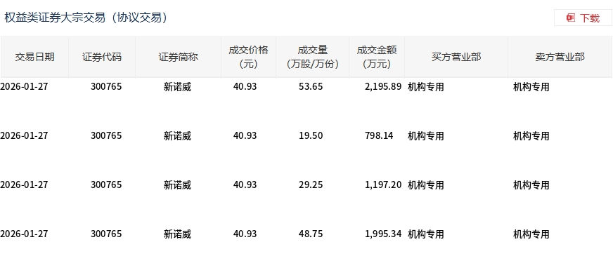 1月27日,新诺威大宗交易成交151.15万股,成交额6186.57万元,占当日总成交额的11.36%,成交价40.93元,较市场收盘价40.93元持平。