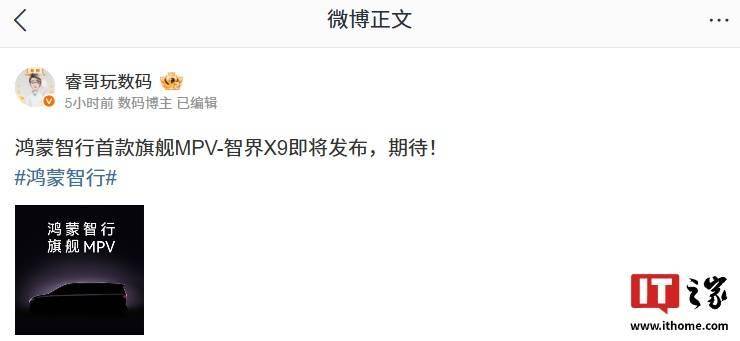 另外,鸿蒙智行旗舰 MPV 的官宣信息也被智界产品总监 @智界海蓝天 转发,进一步论证了新车将归属智界品牌。
