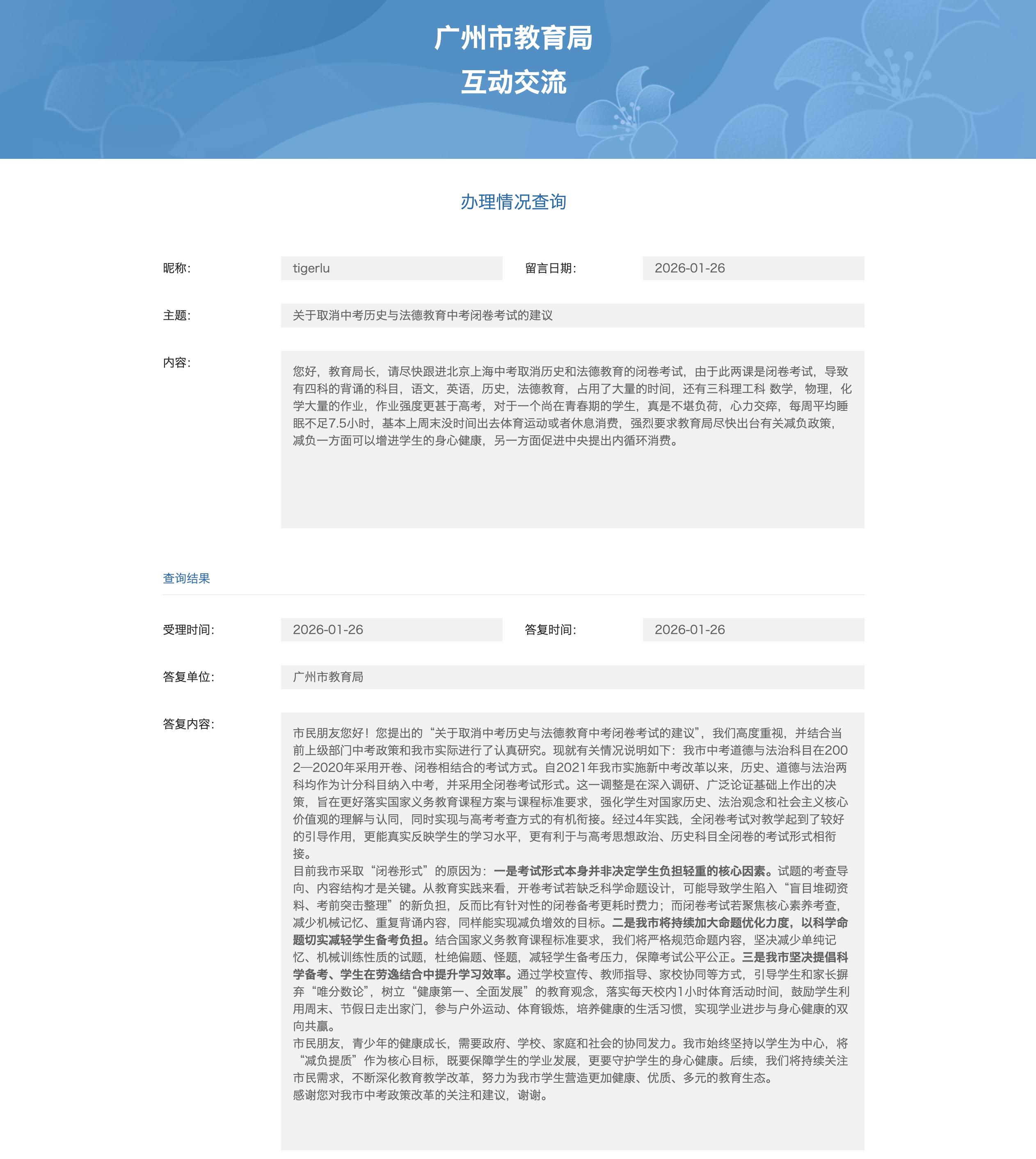 在留言中,该网友提出:“请尽快跟进北京上海中考取消历史和法德教育的闭卷考试,由于此两课是闭卷考试,导致有四科的背诵的科目,语文,英语,历史,法德教育,占用了大量的时间,还有数学,物理,化学大量的作业,作业强度更甚于高考,对于一个尚在青春期的学生,真是不堪负荷,心力交瘁,每周平均睡眠不足7.5小时,基本上周末没时间出去体育运动或者休息消费,强烈要求教育局尽快出台有关减负政策,减负一方面可以增进学生的身心健康,另一方面促进中央提出内循环消费。”