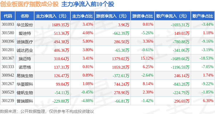 资金流向方面,创业板医疗(970082)指数成份股当日主力资金净流出合计17.62亿元,游资资金净流入合计1.13亿元,散户资金净流入合计16.49亿元。成份股资金流向详情见下表: