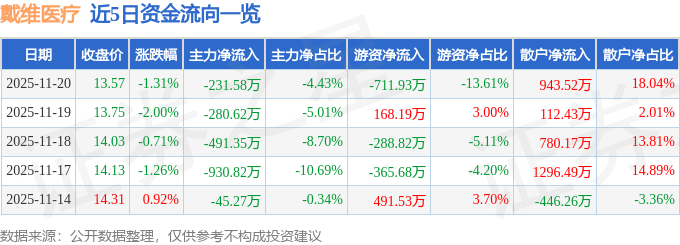 证券之星消息,截至2025年11月20日收盘,戴维医疗(300314)报收于13.57元,下跌1.31%,换手率2.67%,成交量3.83万手,成交额5231.36万元。