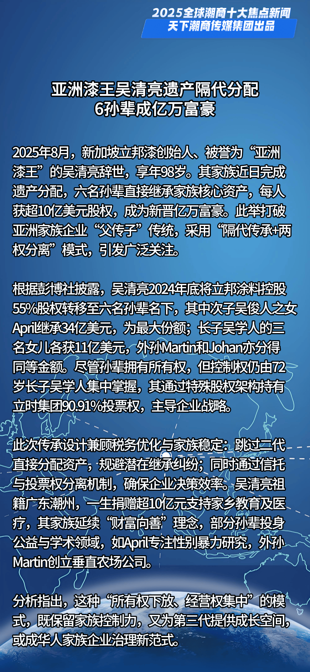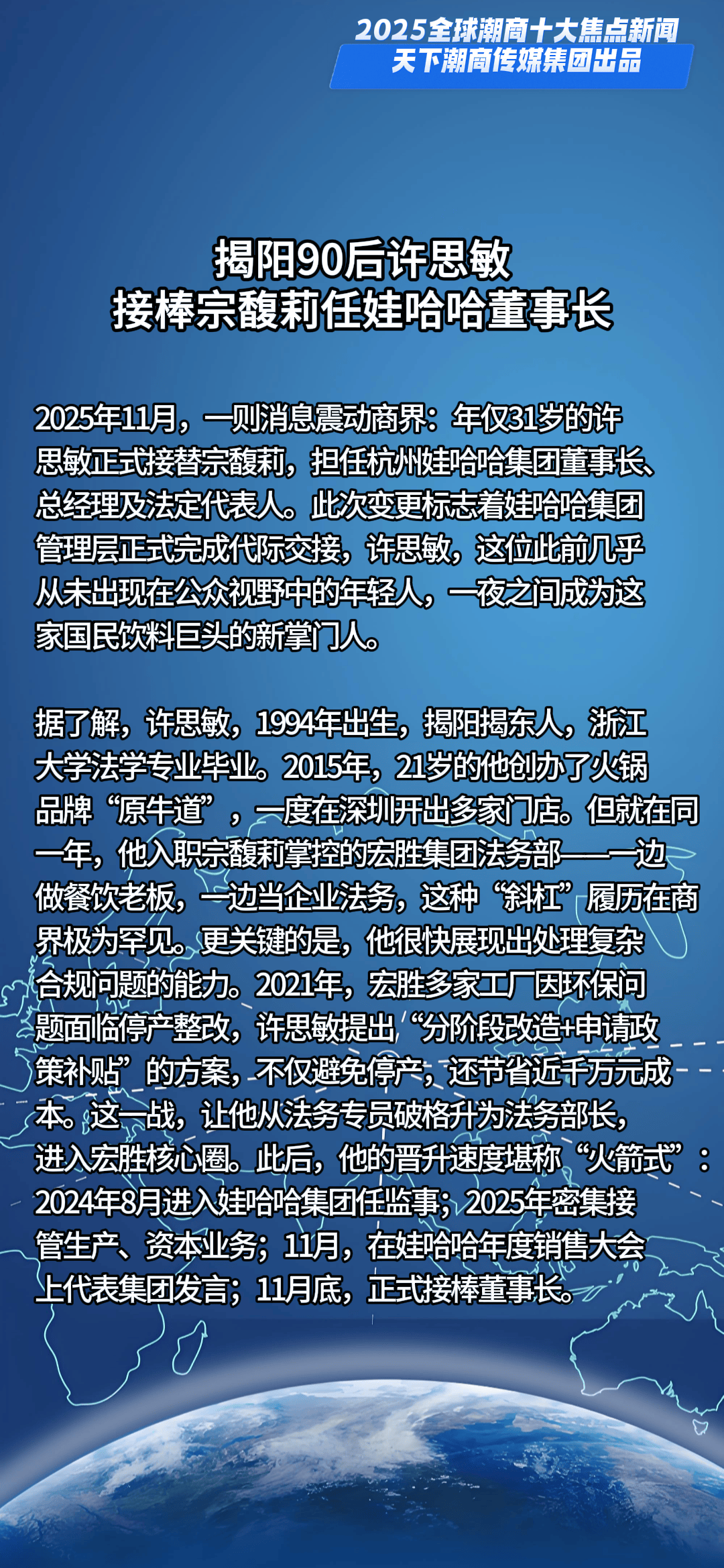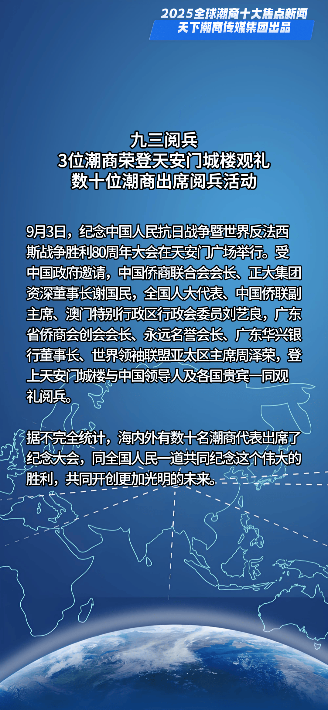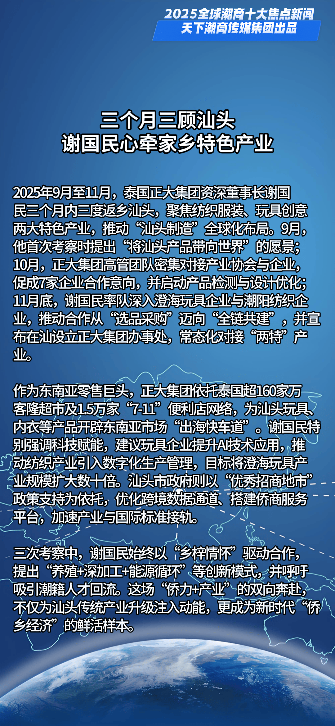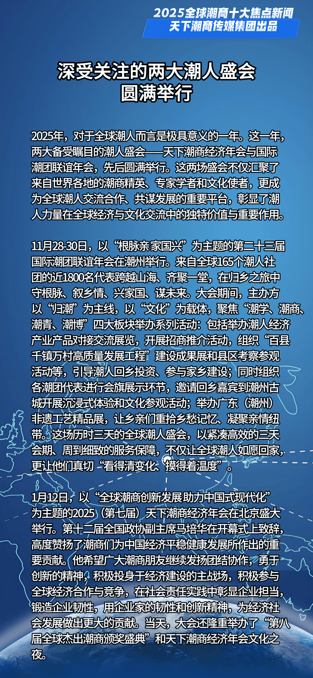 一槌定音,新元已启。当时间的指针划过2024的刻度,全球格局在深度调整中持续嬗变,机遇与挑战如潮水般奔涌交织。面对风云变幻的商业浪潮,全球潮商以勇立潮头的姿态破浪前行,用智慧与汗水浇灌出跨越山海的商业奇迹,在时代的画卷上书写下浓墨重彩的篇章。值此万象更新之际,天下潮商传媒重磅推出新年首份权威榜单——“2025全球潮商十大焦点新闻”,邀您共鉴潮商群体在全球舞台上的高光时刻与硬核实力。
