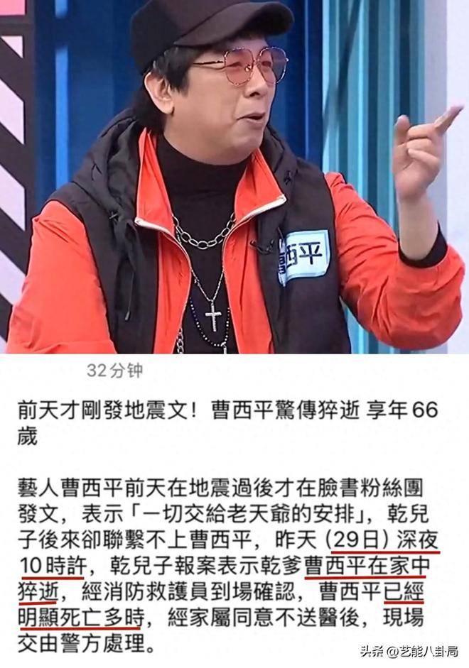 2025年12月29日晚上10点左右,66岁的男艺人曹西平在家中去世。媒体报道称,救护人员赶到现场时,确认曹西平已经去世一段时间。经过家属同意,最终没有将他送往医院,现场由警方进行处理。