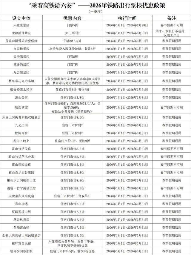 此前,六安市已创新推出“乘着高铁游六安”—2026铁路出行票根优惠政策,2026年1月1日至3月31日,只需凭借7日内抵达【六安站】的有效乘车证明及本人身份证,即可解锁全市29家景区、景点、民宿等专属折扣。
