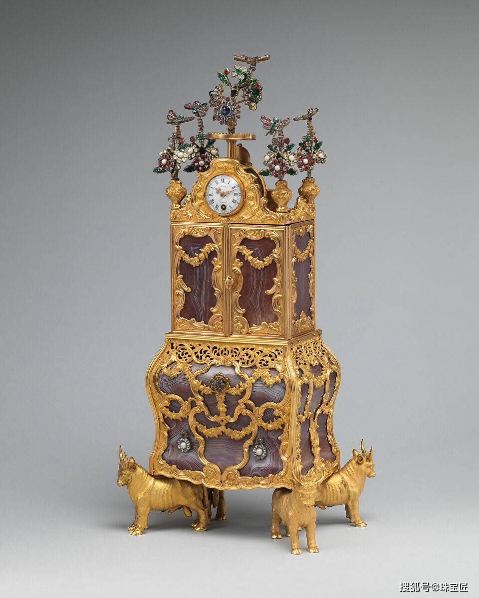 其中内置的复杂机械装置,不仅能实现精准报时,更可驱动小鸟振翅、伞盖旋转、马车徐行,并伴有悠扬乐音,集装饰艺术、机械巧思与跨文化意象于一体,代表了十八世纪欧洲自动机械工艺的巅峰水平。