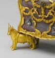 这件作品堪称中西工艺融合的典范,整体以鎏金为底,镶嵌钻石、红蓝宝石与珍珠等名贵宝石,战车造型十分精致,设计成清朝人形象的人偶神态刻画精妙,顶部的飞龙更是融合古老的东方元素(也很符合当时欧洲对中国的刻板印象了)。