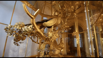这件创作于1770s的杰作,高约3米,由孔雀、公鸡、猫头鹰三件自动机械组成,整座钟以银质为骨、鎏金为表,羽毛处镶嵌细碎宝石,光泽流转间尽显华贵。