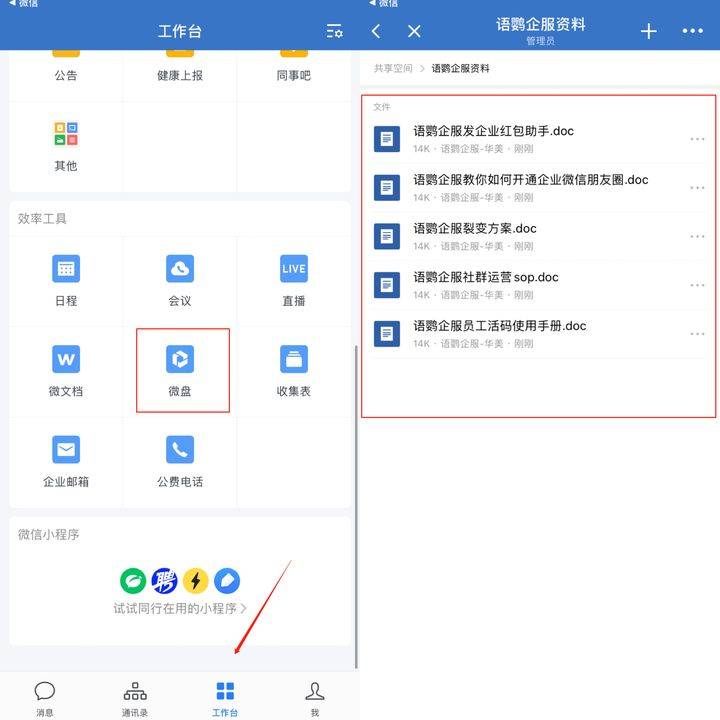 那么,保存到微盘的文件如何在企业微信中找到呢?打开企业微信,【工作台】-【微盘】,找到刚才保存文件的位置就能够找到。