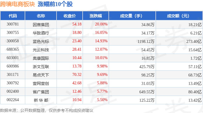 证券之星消息,1月29日跨境电商板块较上一交易日上涨1.09%,因赛集团领涨。当日上证指数报收于4157.98,上涨0.16%。深证成指报收于14300.08,下跌0.3%。跨境电商板块个股涨跌见下表: