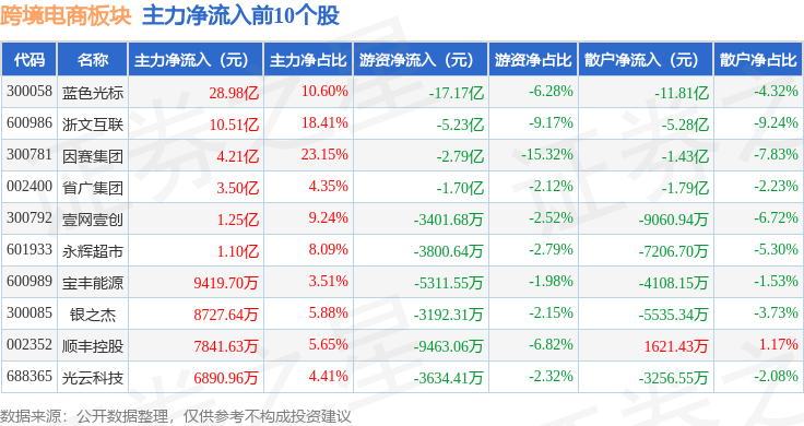 从资金流向上来看,当日跨境电商板块主力资金净流入45.89亿元,游资资金净流出32.28亿元,散户资金净流出13.61亿元。跨境电商板块个股资金流向见下表: