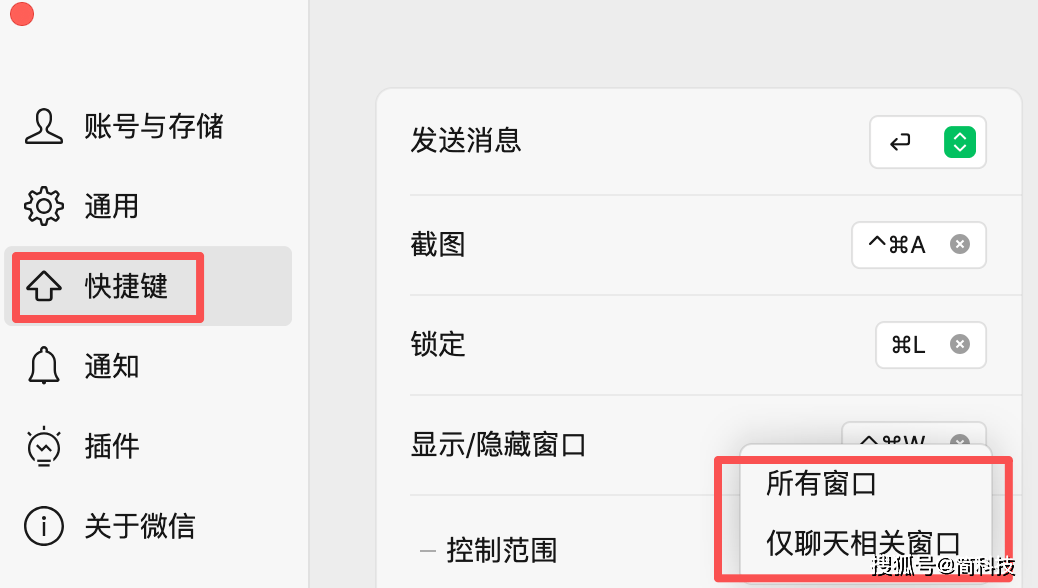 另外在微信的设置—快捷键,现在「显示/隐藏窗口」中新增了「控制范围」,用户可选择所有窗口或仅聊天相关窗口。