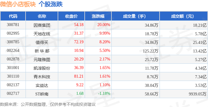 证券之星消息,1月29日微信小店板块较上一交易日上涨6.43%,因赛集团领涨。当日上证指数报收于4157.98,上涨0.16%。深证成指报收于14300.08,下跌0.3%。微信小店板块个股涨跌见下表: